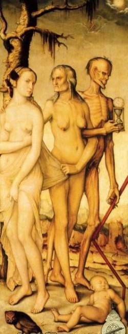 La morte è l’ultimo tabù rimasto all’Occidente, uno scandalo perché estranea alla tradizione cristiana: la morte, infatti, non era contemplata dal progetto originario di Dio, ma è la conseguenza del peccato originale. Se in Occidente l’evento della morte è un tabù, la rimozione della mortalità è tuttavia un’esigenza diffusa in tutte le culture. “L’uomo è uomo proprio perché intende liberarsi dal dolore, dalla morte; per questo ha inventato il mito, la religione, la stessa scienza, la quale non è una contemplazione disinteressata e ingenua, bensì la longa manus dell’istinto di sopravvivenza dell’uomo”, afferma Severino. La speranza che la scienza possa curare la morte è l’ultimo capitolo di una preistoria che inizia nei sogni dell’homo e diventa storia con la trasfigurazione del mito in religione. In attesa che la scienza curi la morte, ci si accontenta di curare la sua estetica, l’invecchiamento e la malattia. Nel quadro di Klimt “Le tre età della donna” la donna anziana si nasconde il volto con una mano. Il gesto è la versione politicamente corretta di uno scandalo che nel dipinto Las Edades y la Muerte, di Hans Baldung Grien, è raccontato senza il velo di Maja dell’illusione.