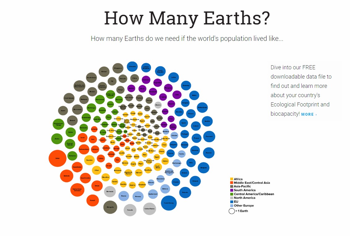 Se qualcuno è interessato a conoscere il proprio impatto sul Pianeta potrà chiederlo al seguente link www.footprintcalculator.org/, scaricare il pacchetto di dati relativi al link www.footprintnetwork.org/licenses/public-data-package-free-2018/, oppure accontentarsi di un racconto breve utilizzando quest’altro indirizzo http://data.footprintnetwork.org/#/.